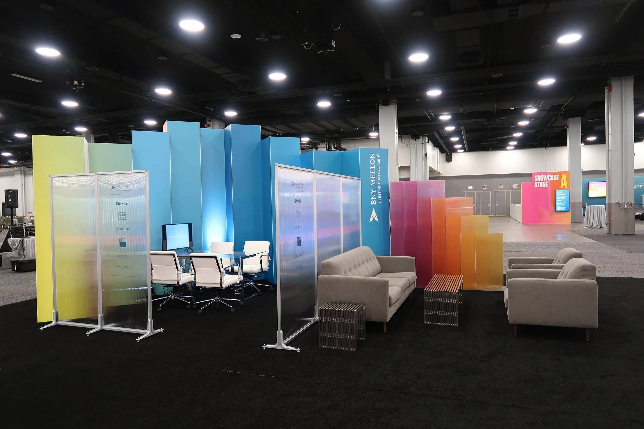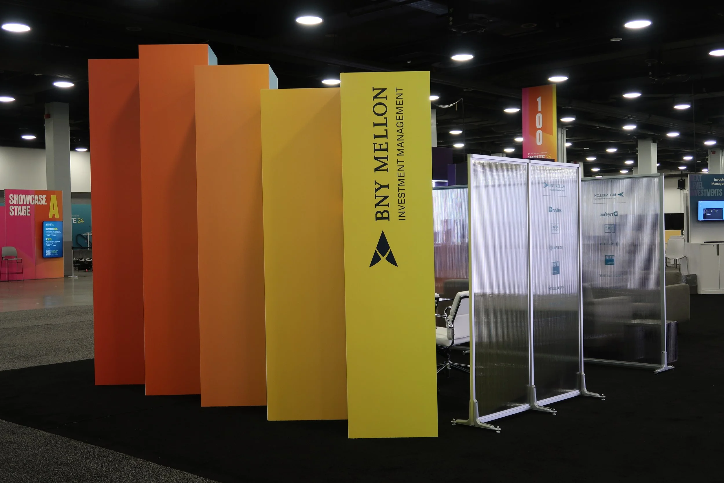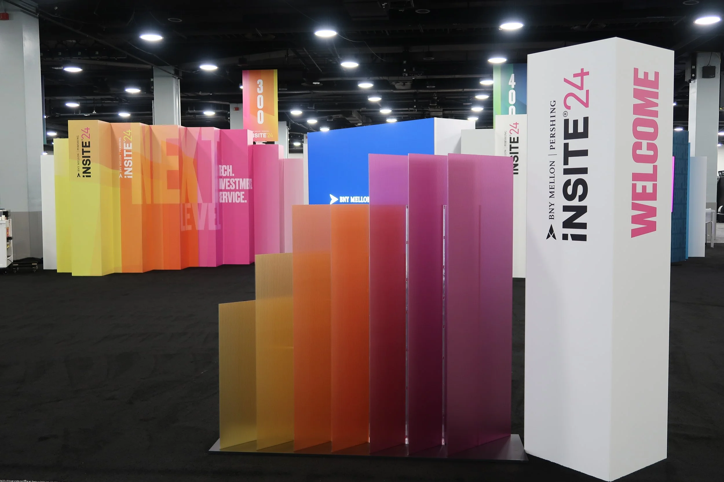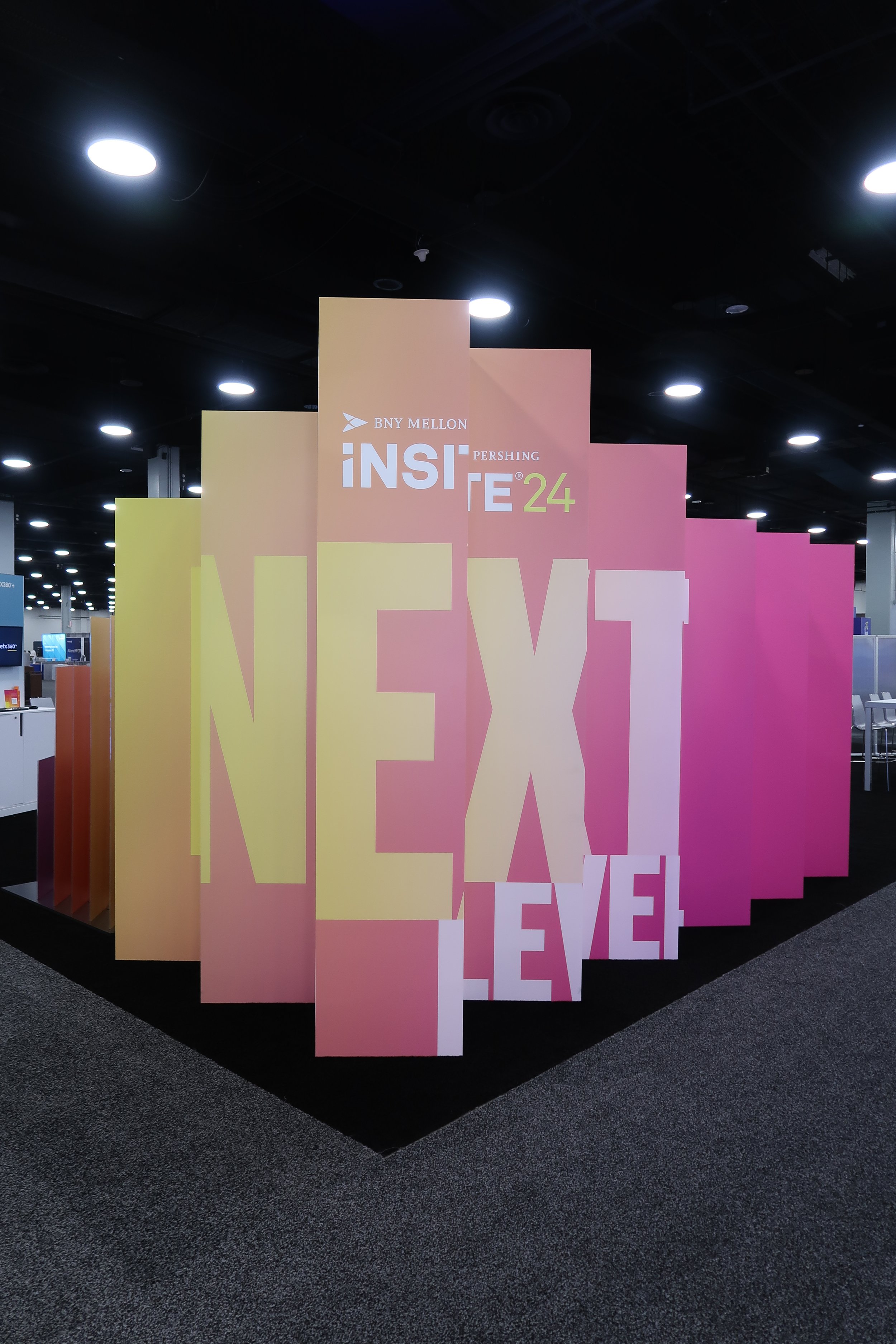 Set within tight budget, timeline and vendor constraints, the BNY team was extremely happy with the design and installation. Serving as photo moments themselves, the converging towers defined the Pavilion & brought the conference Next Level theme to new dimensions. We were able to integrate dozens of products as well as meeting areas and a presentation space for the high-demand networking space.