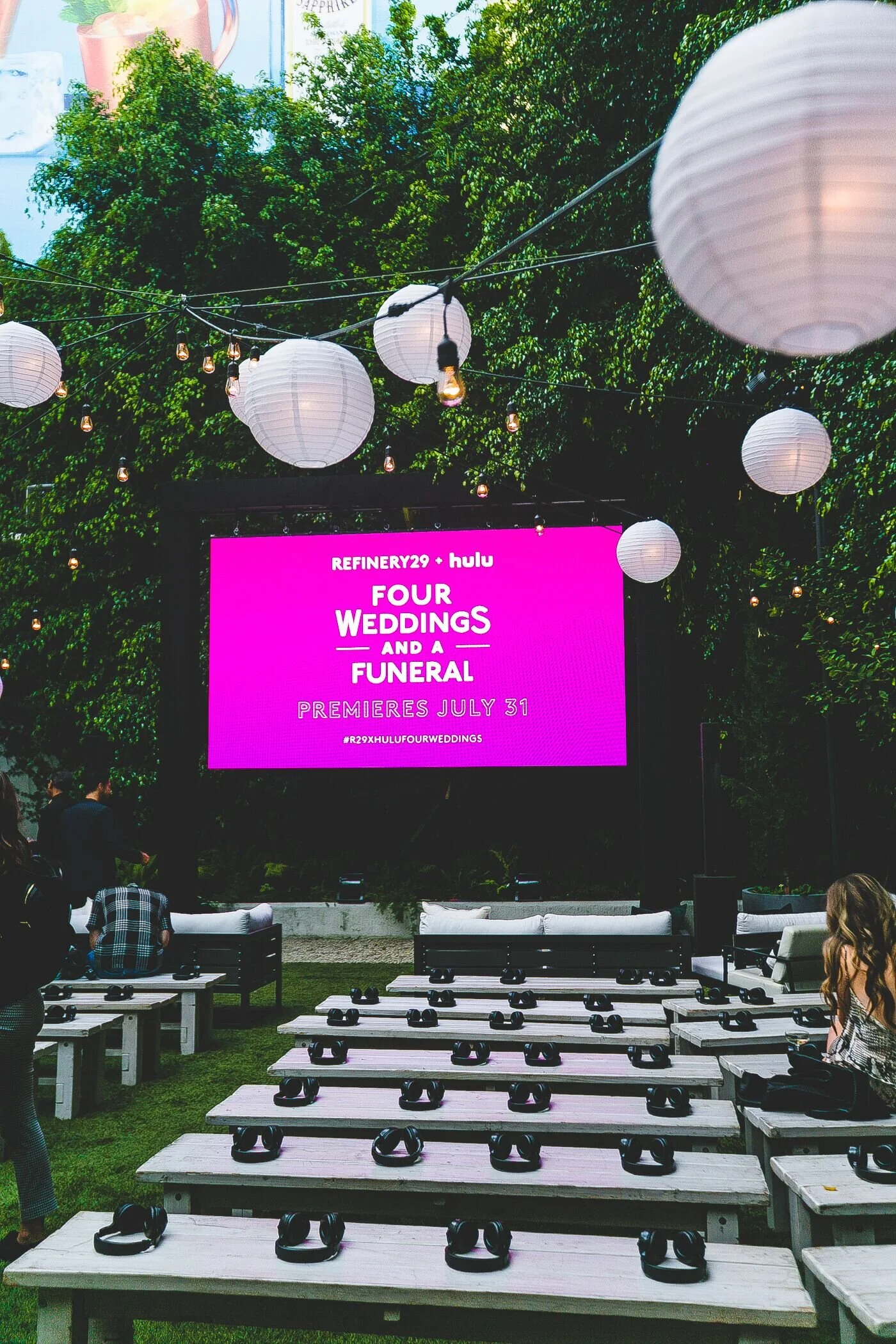 Refinery29 invited 150 curated guests to this unfettered, summertime screening party at the House on Sunset to kick off Hulu’s newest show Four Weddings and a Funeral — co-created by Mindy Kaling. Guests entered a rehearsal dinner style space where they were immediately welcomed with a glass of champaign and brand ambassadors dressed as bridesmaids and groomsmen. They were then encouraged to explore the manicured garden and find a seat for a outdoor screening of the first episode (one week before the premiere on Hulu!) and a surprised Q&A from the cast! Afterwards, guests were able to jam to nostalgic and energetic tracks as they explored highly Instagrammable photo moments, interactive touches, passed horderves and custom cocktails.